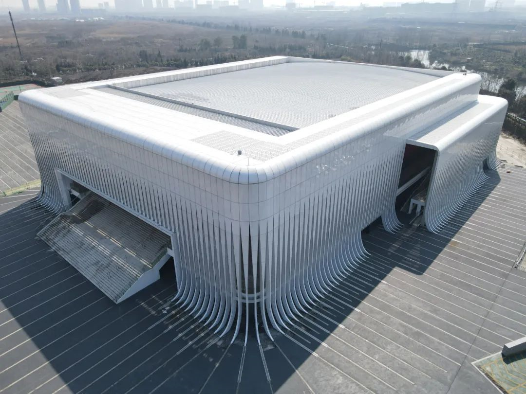 这些挂在场馆主体外的“水幔”,不仅仅是装饰品,更有着实际作用。据介绍,这其实是一道遮阳层,类似置于建筑之外的“百叶窗”,隔热效果好,能让场馆内更凉快,还可以提高室内视觉舒适度。