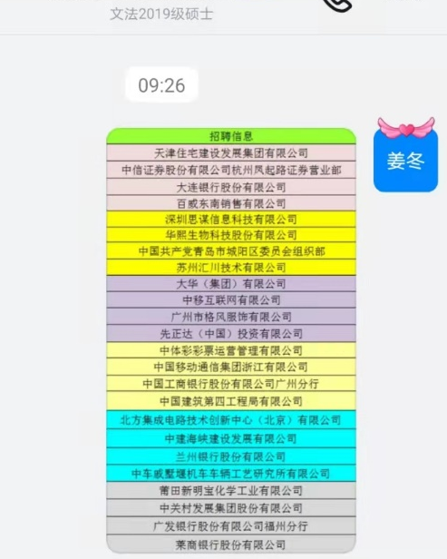 文法学院研究生辅导员 姜冬发送的 “彩虹就业卡”如期与毕业生同学们相见 ,带着精心收集的各类就业信息,为广大毕业生带来第一手的就业资讯。 既要做好疫情防控工作,更要帮助学生在疫情之下找到更满意的工作。