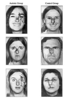 孤独症患者(左)与正常对照组(右)的眼动轨迹 Pelphreyet al.,(2002)