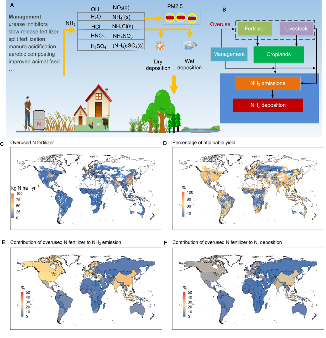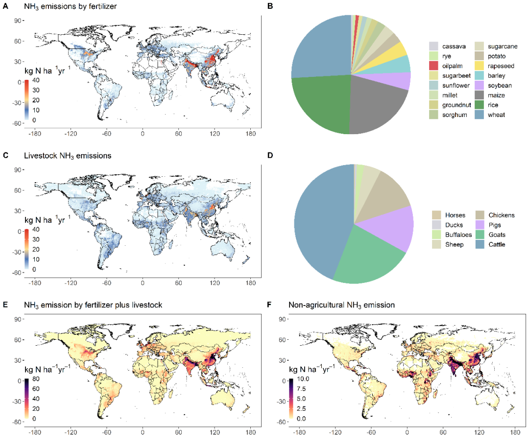 氨气作为大气中主要的碱性气体,不仅是大气细颗粒物PM2.5污染的重要推手,更是大气氮沉降的重要贡献源。过去几十年来大气氨排放与农业生产活性氮过量使用密切相关,然而全球农业系统哪些作物或动物具有高氨排放潜力及农业氨排放如何影响全球氮沉降的时空格局尚不清楚。