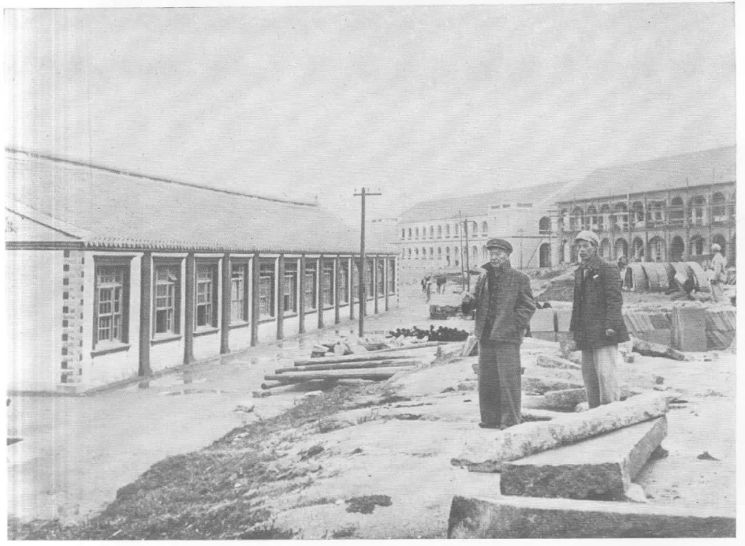 陈嘉庚先生(左)对集美各校建设工程十分关心,经常亲到工地督导施工。