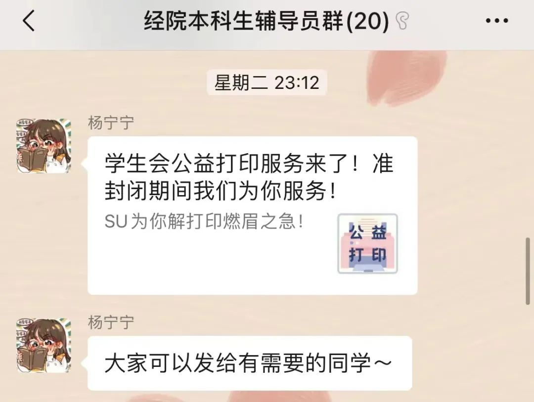 据悉,对于大学三年级的同学来说,现在正是申报暑期夏令营的时候。经济学院的一些同学因无法打印材料而焦灼着。了解到同学们的需求后,2019级经济学系本科生班辅导员、党支部党员服务队队员韩志周立即向学院反馈情况。在获悉南区曾有一个自发“互助打印群”之后,2020级经济学系本科生班辅导员樊亚坤提出并邀请各班辅导员进入打印群,辅导员们分别邀请了有打印需求的同学。