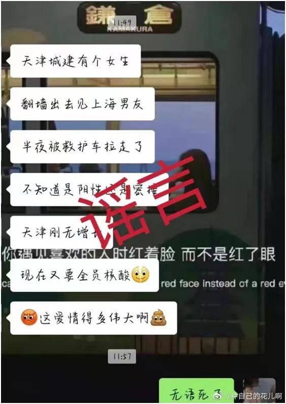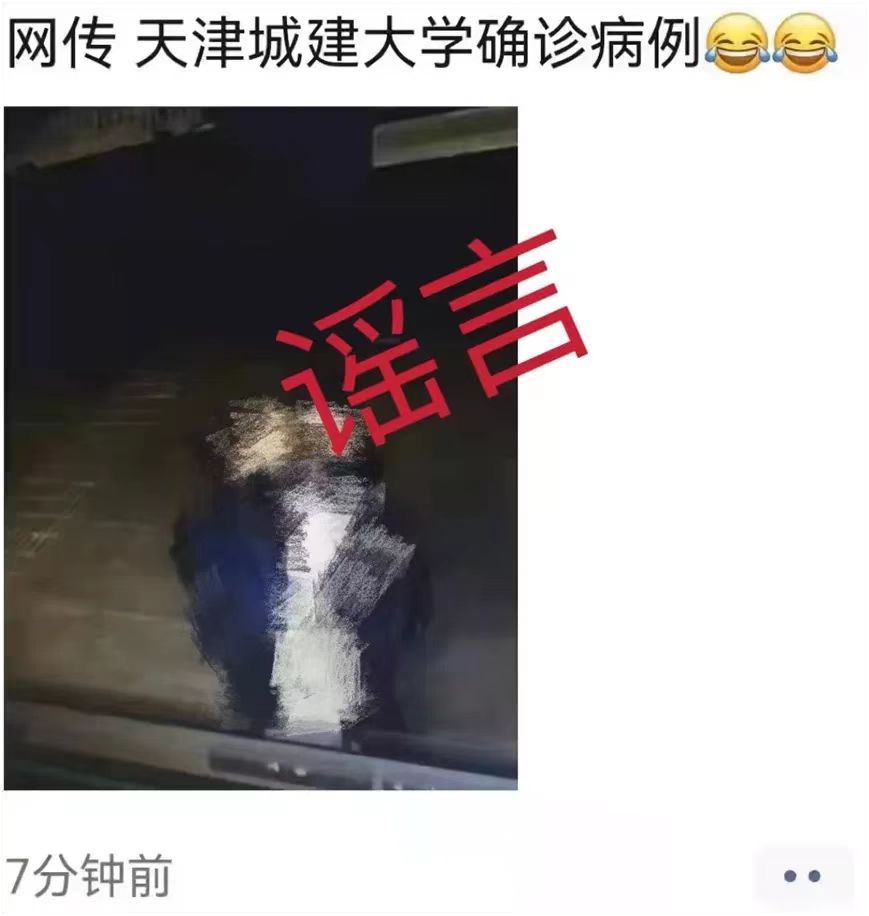 据天津市互联网违法和不良信息举报中心微信公众号“天津辟谣”3日晚间的信息,接网民举报,有人在圈群传播“天津城建大学有女生翻墙”“两位男士为‘天津城建大学确诊病例’”等信息。经与有关部门核实,均为不实信息,不存在所谓的“翻墙女生”,网传视频中人员并非天津市学生。