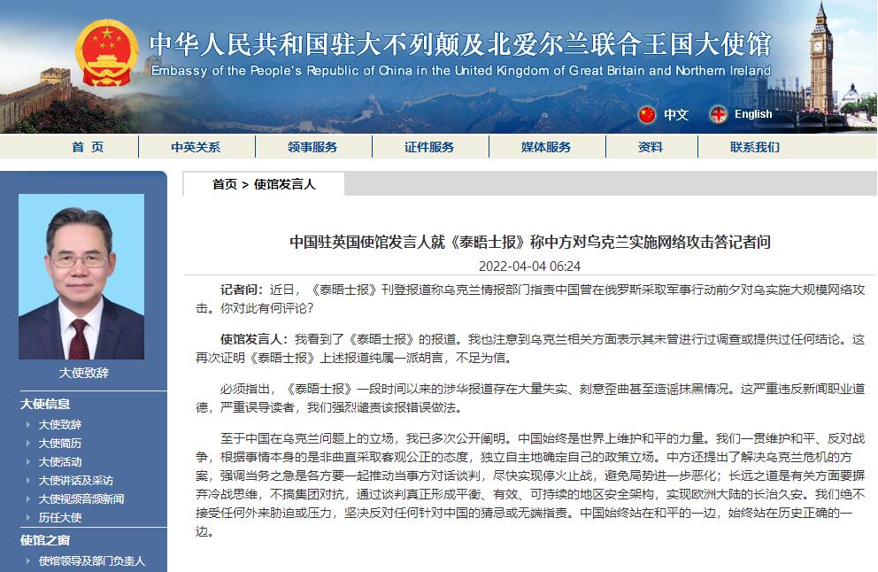 据中国驻英国大使馆网站今天发布的消息,我驻英国使馆发言人就《泰晤士报》称中方对乌克兰实施网络攻击答记者问。
