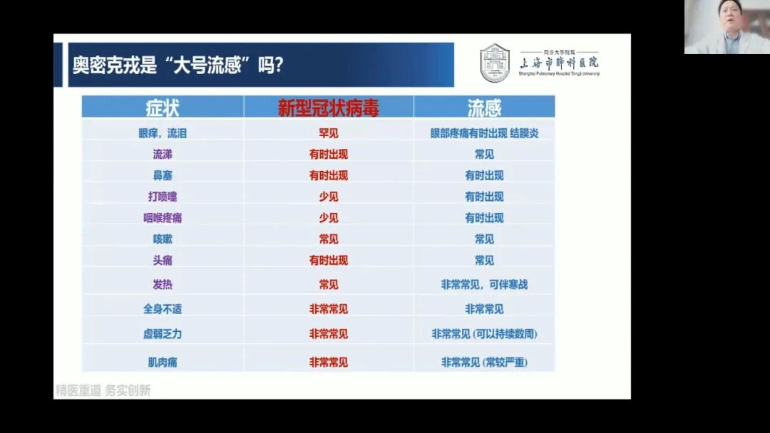 “我想同学们这几天更加体会到奥密克戎的传染性。”同济大学附属上海市肺科医院党委副书记、上海市新冠肺炎医疗救治专家组专家徐金富教授说。他介绍了奥密克戎突变株的特点和临床表现。相较于之前的新冠病毒,奥密克戎具有很强的传播能力,病毒进入人体细胞的机会减少,不易感染肺部深处细胞,所以无症状和轻症感染者居多。