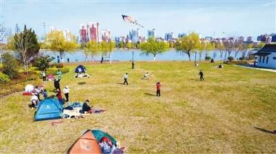 江苏宿迁市民在京杭大运河畔绿地上搭帐篷、放风筝,乐享春日好时光。马海峰摄(人民图片)