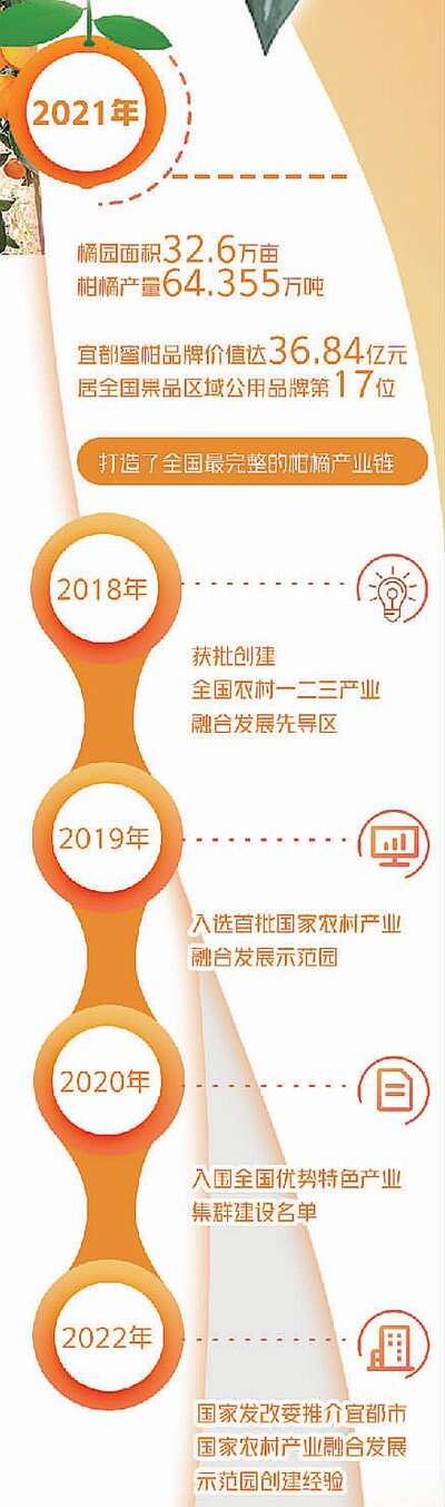 种柑橘,发展第一产业;加工柑橘,促进第二产业;依托全国唯一的“国家柑橘公园”发展旅游业……宜都的柑橘产业正推动着三次产业联动发展,成为全要素、全产业的“甜蜜产业链”。