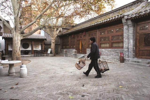 一位市民提着鸟笼从史家胡同博物馆院落走过。视觉中国/供图