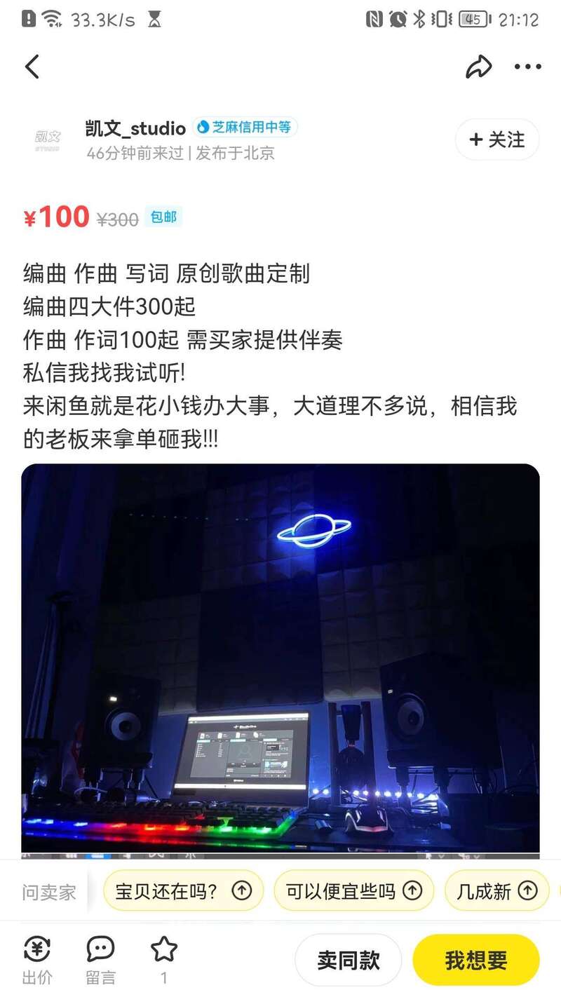 活跃于闲鱼的原创音乐人凯文目前是一位高校学生,学习音乐多年,自己也是流行音乐爱好者,“早几年我有自己试着作词作曲,小打小闹的算作是各种习作吧。”今年年初,凯文踏进了闲鱼原创音乐出售市场。他和几个朋友合作,以工作室的形式开始在闲鱼接单,“我们几个人都是会音乐的,不过各自喜欢、擅长的领域都各有不同,比较擅长的乐器也不一样,但是合在一块基本就是比较全能的了。”虽说正式开张小半年还不到,但是生意确实是很不错,凯文透露:“保守估计一个月三四十单,一个月四五千的收入不是问题。”因为还有课业需要完成,凯文和他的朋友们并没有将全部精力投入闲鱼小店的生意当中,只在课余的时间来接单,在问及对于当前收入的评价时,凯文觉得如果只作为副业来看的话也勉强,但是如果这要是作为主业的话,三五千很明显是付出与收入不成正比了。