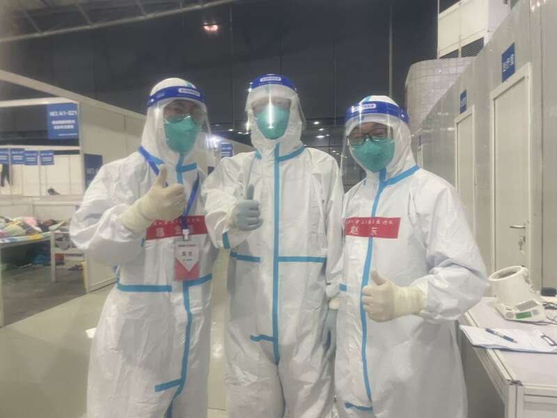 4月7日凌晨,武汉大学人民医院心血管外科医生昌金星(左一)和同事们进入方舱医院工作。(武汉大学人民医院供图)