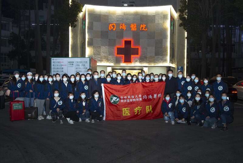4月3日凌晨,华中科技大学同济医学院附属同济医院援沪医疗队集结,准备出发。(华中科技大学同济医学院附属同济医院供图)