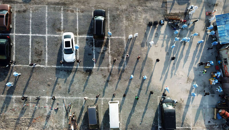 4月4日,在上海市黄浦区豫园街道,工作人员为居民进行核酸检测采样(无人机照片)。新华社记者 金立旺 摄