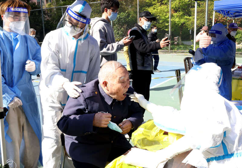 4月4日,87岁的虞祖荣老人在志愿者的协助下进行核酸检测采样。新华社记者 陈飞 摄