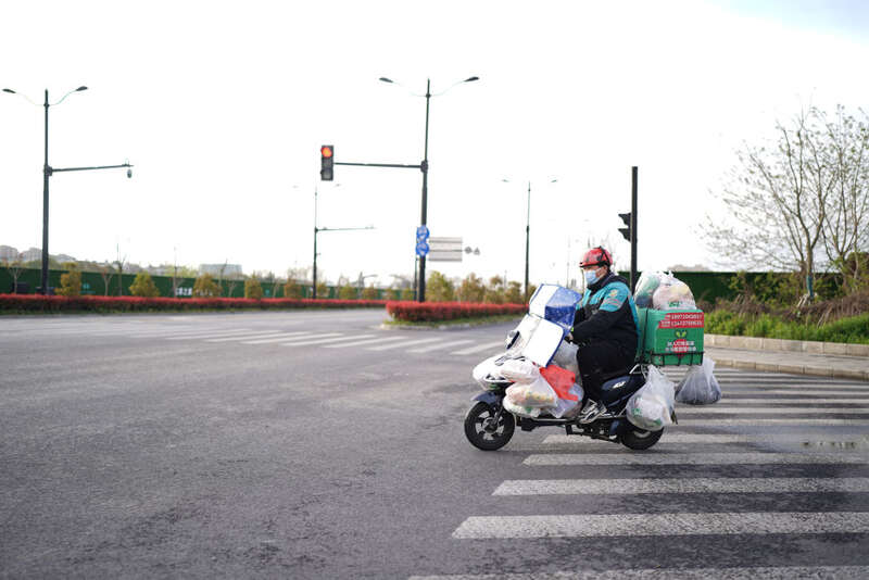 4月1日早上,配送员在配送货物。新华社记者 丁汀 摄