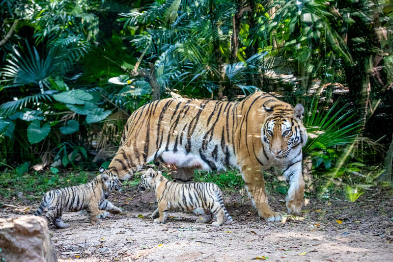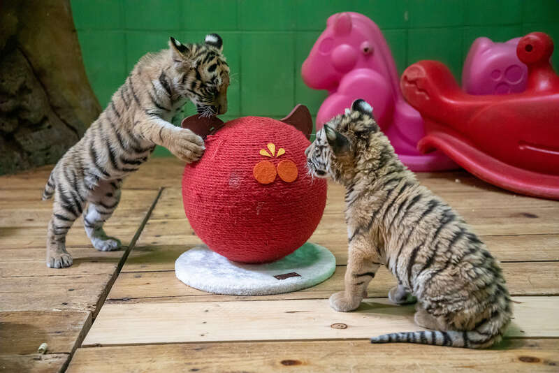 为了保障3只体型较弱的孟加拉虎宝宝能够健康成长,保育团队决定进行人工育幼,将3只幼仔分别放在3个育婴箱内照料,由2名具有多年动物幼崽保育经验的保育员进行24小时看护养育。保育团队每隔3天对幼崽进行一次体检,尽数掌握小虎的生长指标。1个多月过去了,3只小虎体重已增至正常水平,目前已脱离育婴箱,进入喂食肉末阶段。