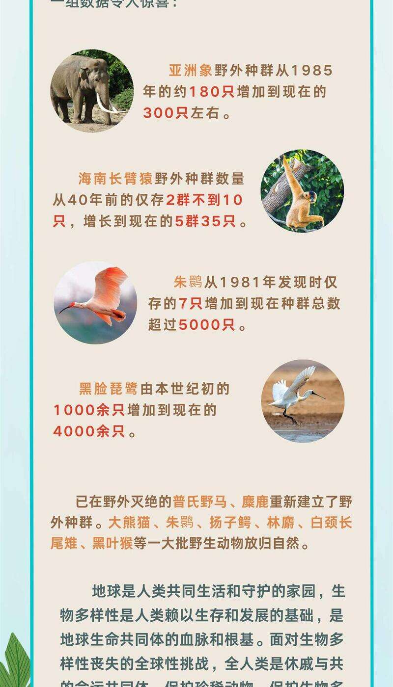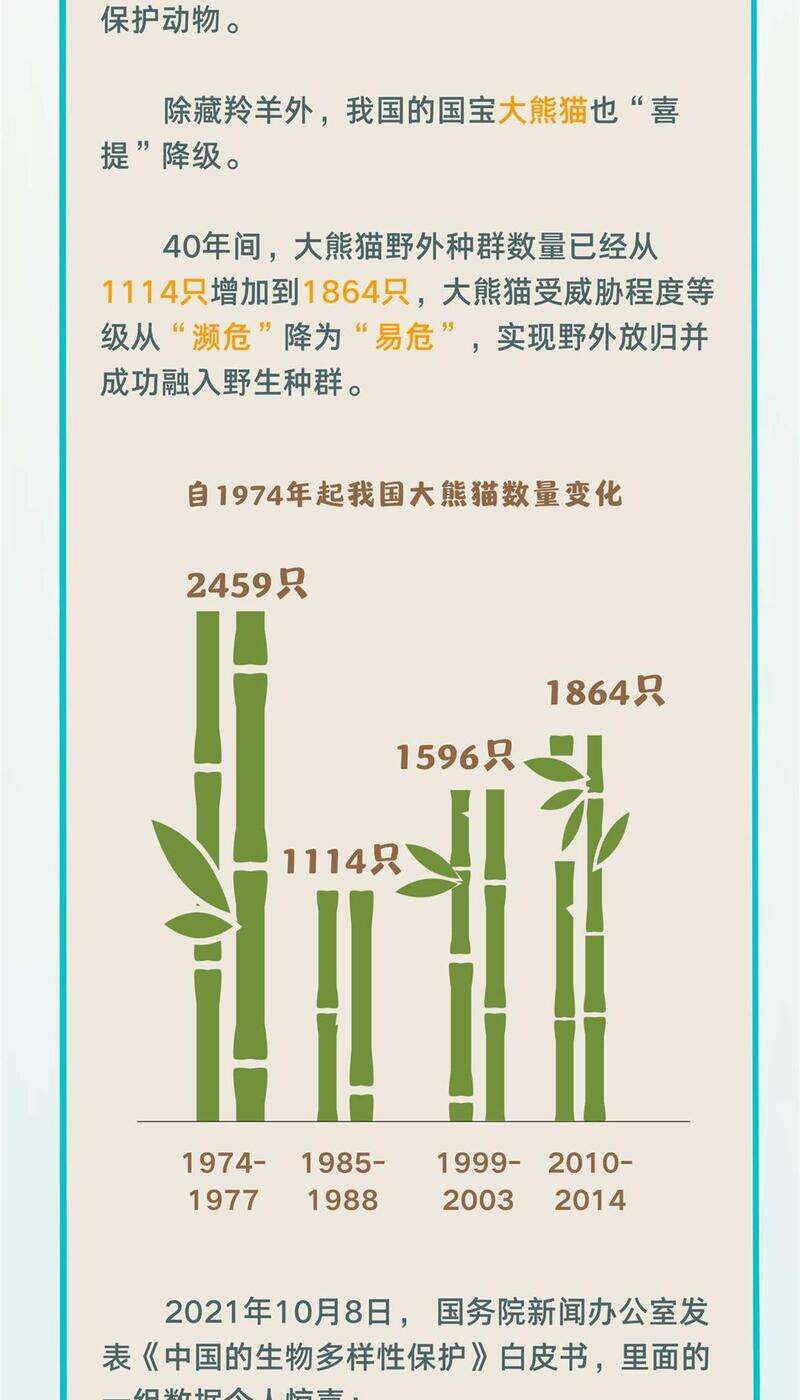4月8日是国际珍稀动物保护日。我国是地球上生物多样性最丰富的国家之一,幅员辽阔、景观多样的国土为数万种野生动物提供了赖以生存的家园。2021年10月发布的《中国的生物多样性保护》白皮书里,一组数据令人惊喜:随着人工繁育大熊猫数量快速优质增长,40年间大熊猫野外种群数量已经从1114只增加到1864只,大熊猫受威胁程度等级从“濒危”降为“易危”。与大熊猫一起“喜提降级”的还有藏羚羊,同时“东方宝石”朱鹮从7只增至5000余只……这些珍稀动物“喜提降级”的背后,是我国生物多样性保护工作的显著成果。
