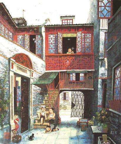 有支专耕沪语民谣的乐队初成于2001年,在上海某条石库门的弄堂里,他们给自己取名为“顶楼的马戏团”。多年以后,一曲《上海童年》勾连起多少上海人心底的脉脉温情。图为海派画家李守白《弄堂风情》