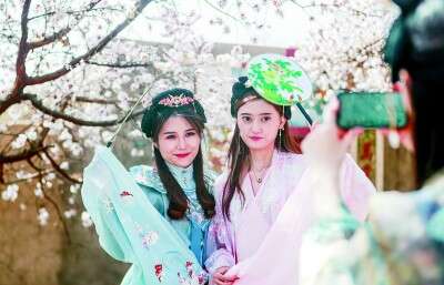 “唐风古韵兴庆宫,万紫千红满园春”。在陕西的兴庆宫郁金香、牡丹春季花卉展上,近万株牡丹花搭配唐风古韵屏风的造型,凸显唐兴庆宫历史文化魅力。华服爱好者、汉服社团开展了“华服花海游园”活动,在牡丹花盛开期间进行“唐明皇杨贵妃游园赏牡丹”主题互动。在河南,第四届河南云台山汉服花朝节冲上热搜,似锦繁花中“竹林七贤”“十二花神”的风姿点燃了年轻人对于“汉服赏花”的热情。
