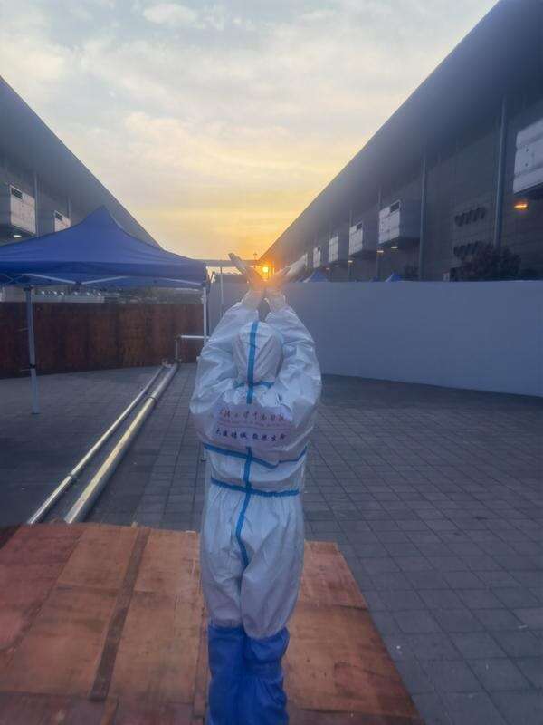 图说:同事为武汉大学中南医院援沪医疗队队员荣梦玲拍下的“托举太阳”