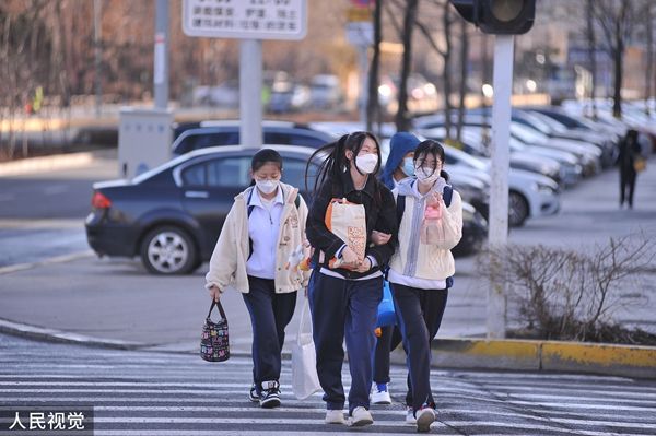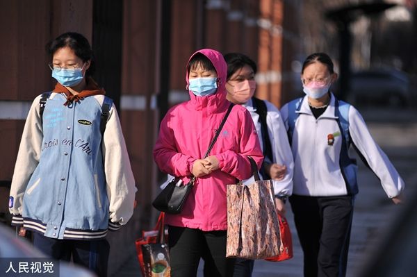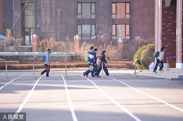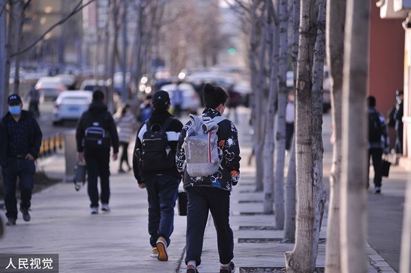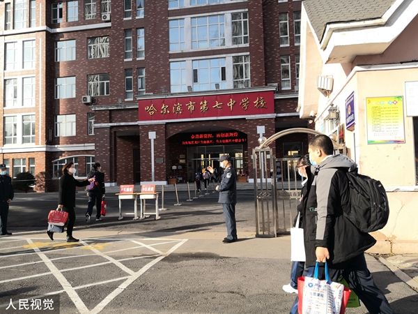 2022年4月12日,哈尔滨市道里区第七中学门前,学生有序走进校园。4月10日,哈尔滨市应对新型冠状病毒感染肺炎疫情工作指挥部发布第58号公告,全市中小学、托幼机构自4月12日起,分期分批有序恢复线下教学。