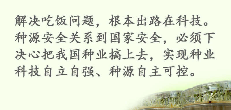 4月10日下午,习近平总书记在海南省三亚市崖州湾种子实验室考察调研时强调,种子是我国粮食安全的关键。只有用自己的手攥紧中国种子,才能端稳中国饭碗,才能实现粮食安全。种源要做到自主可控,种业科技就要自立自强。这是一件具有战略意义的大事。要弘扬袁隆平等老一辈科技工作者的精神,十年磨一剑,久久为功,把这件大事抓好。