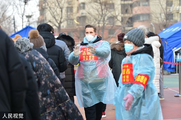 2022年1月15日,天津第三轮全员核酸检测现场,李翰文在引导大家排队保持间距。
