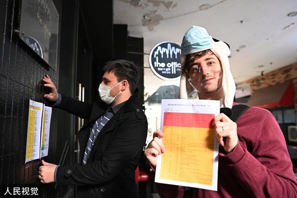 2021年11月11日,来自英国的社区助理丁一睿展示疫情防控宣传单。 中新社记者 安源 摄