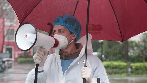 2022年3月20日,上海,外籍志愿者助力社区疫情防控。外籍志愿者喊话居民下楼做核酸检测。(视频截图)