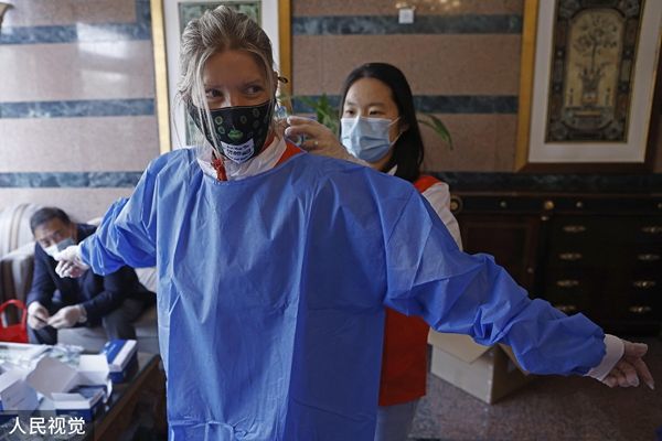 2022年4月6日,上海,华山花园小区志愿者帮助来自美国的Erika穿隔离服。 中新社记者 殷立勤 摄