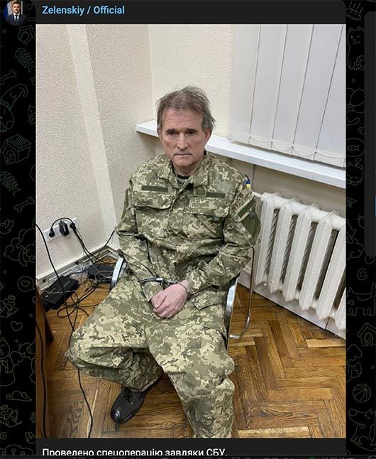 在泽连斯基12日发布的照片中,身着乌军军装的梅德维丘克衣衫凌乱,戴着手铐坐在一处暖气片旁边。泽连斯基配文说,“乌克兰国家安全局(SBU)执行了特别行动。干得好!详情稍后公布,荣耀归于乌克兰!”