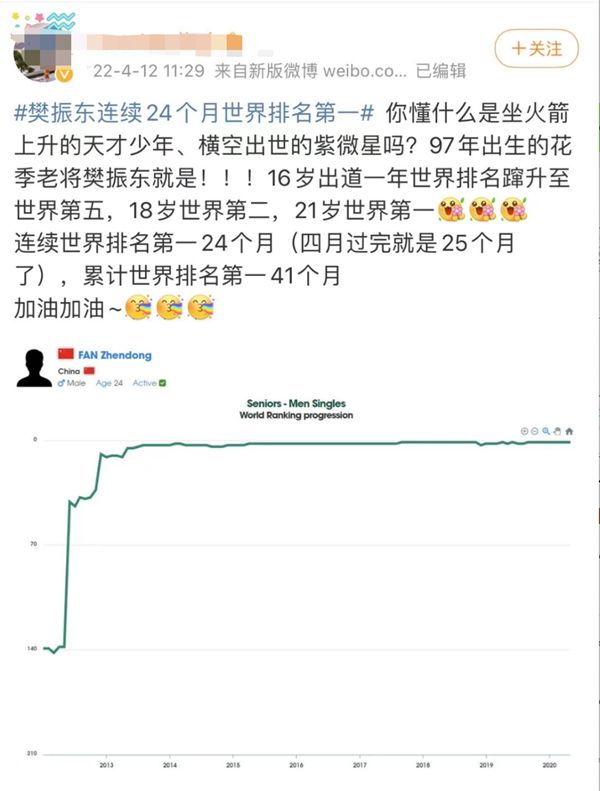 樊振东的世界排名积分已经超过10000分,累积10598分,而第二位的马龙是6804分,第三位的巴西队雨果有5033分,第四位的梁靖崑是4941分。樊振东首登男子世界第一是2018年4月,当时他只有21岁。2020年4月,他重返世界第一并保持至今,达到连续24个月雄踞世界第一宝座。
