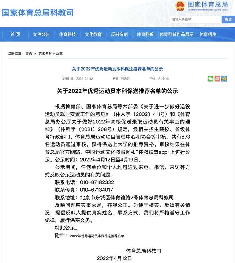 4月12日,国家体育总局科教司网站发布关于2022年优秀运动员本科保送推荐名单的公示,共有873名运动员获保送大学推荐资格,公示时间为2022年4月12日至4月19日。