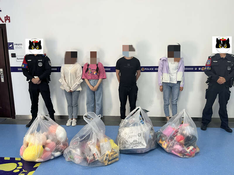 警方抓获的部分犯罪嫌疑人与收缴的玩具。浠水警方供图