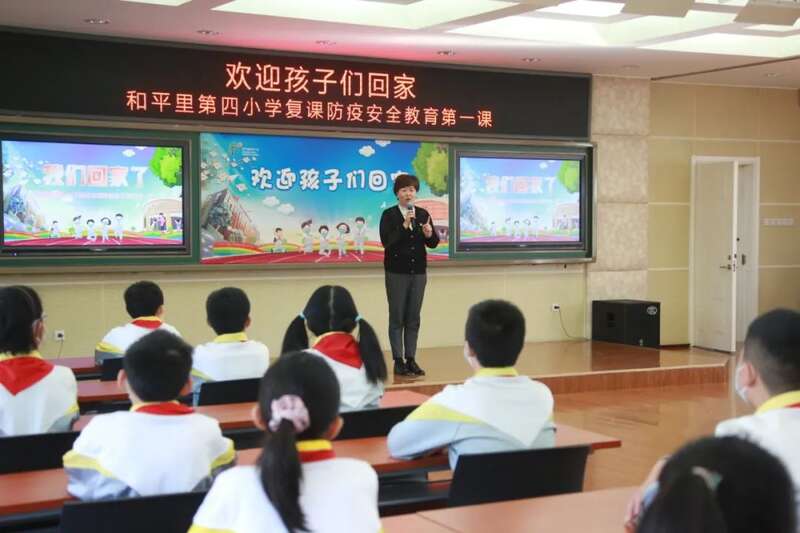3月中旬,受疫情影响,和平里四小三个校区停课,还有200余名低年级学生被集中隔离。4月11日,返校第一天,学校安排了“欢迎孩子们回家”为主题的复课防疫安全教育第一课。学生们回顾了居家学习的经历,讲述了自己的抗疫小故事。
