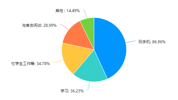 除夜间使用手机外,宿舍夜谈也是导致大学生熬夜的因素之一。经统计,有近三成的学生表明自身多数是由于“宿舍夜间谈话”太过尽兴、忽略了时间而导致熬夜。