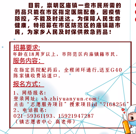 记者获悉,由于崇明区有不少重病患者均须在上海市区配药,但目前上海市区部分区域仍处在较为严格的封控管理中,因此,“配药难”成为崇明人的一大难题。为此,崇明区庙镇发起了一场志愿者招募行动,面向上海市区防范区内的市民,在指定医院配药后,送至G40陈家镇收费站口。