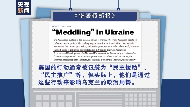 美国华盛顿邮报2004年12月曾披露,美国曾插手乌克兰2004年选举,包括资助多个政治组织,为反对派领导人访美埋单等。文章说,美国的行动通常被包装为“民主援助”“民主推广”等,但实际上,他们是通过这些行动来影响乌克兰的政治局势。