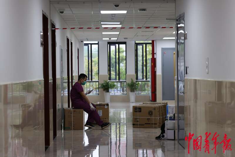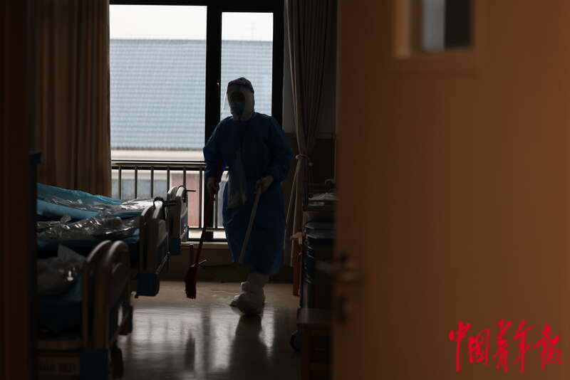 4月13日,上海市浦东新区,在浦东医院曹路透析中心,一名工作人员正在透析室内打扫卫生。中青报·中青网记者 李强/摄