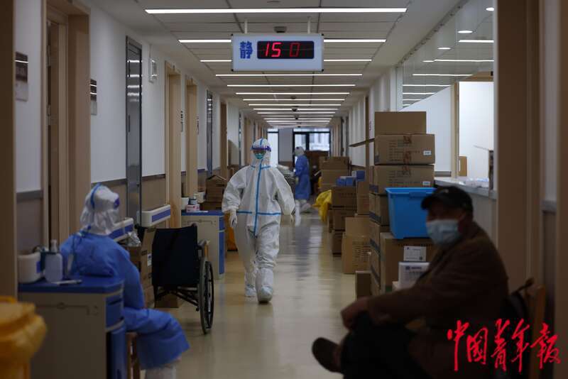 4月13日,上海市浦东新区,一名身穿防护服的医护人员走在浦东医院曹路透析中心透析室外的走廊上,有陪同病患前来透析的家属在走廊等待着。中青报·中青网记者 李强/摄