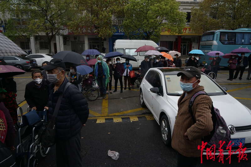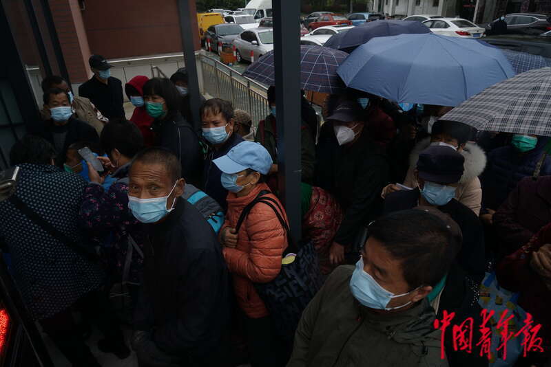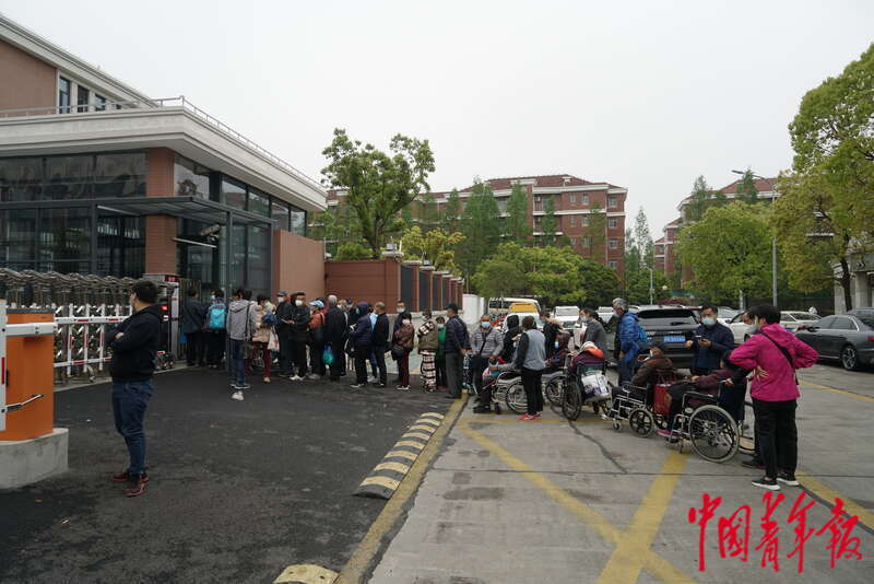 4月13日,上海市浦东新区,浦东医院曹路透析中心大门口排起长队,尿毒症血液透析患者等待入院。中青报·中青网记者 李强/摄