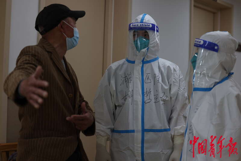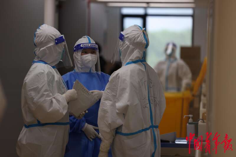 4月13日,上海市浦东新区,当天下午,浦东医院曹路透析中心交接班的医护人员抵达。中青报·中青网记者 李强/摄