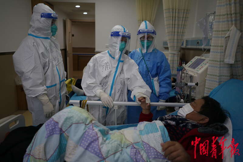 4月13日,上海市浦东新区,浦东医院曹路透析中心护士长赖碧红(中)、主任李明哲(左)与在该透析室值班的浙江援沪护士林剑靖(右)看望一位正在接受血液透析的病人。4月7日,该血透中心正式开始接收病人。这里除了上海本地医护人员外,也有来自浙江、湖北等地的援沪医护人员。中青报·中青网记者 李强/摄