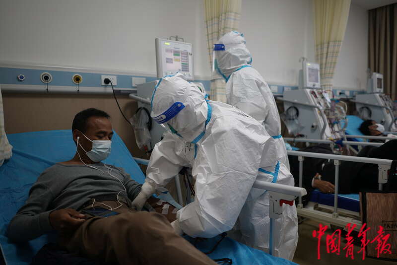 4月13日,上海市浦东新区,医护人员正在检查一名患者的透析管。中青报·中青网记者 李强/摄