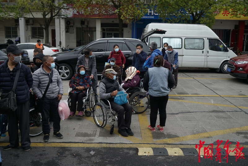 4月13日,上海市浦东新区,几名老人坐在轮椅上等待进入浦东医院曹路透析中心接受透析。中青报·中青网记者 李强/摄