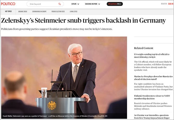 特别是,柏林和基辅之间进行了数天准备后,泽连斯基在施泰因迈尔计划秘密访问的几小时前才通报其“拒见决定”,而乌克兰官员将泽连斯基的决定透露给了德国《图片报》,更是加深了对于德国的“外交羞辱”。