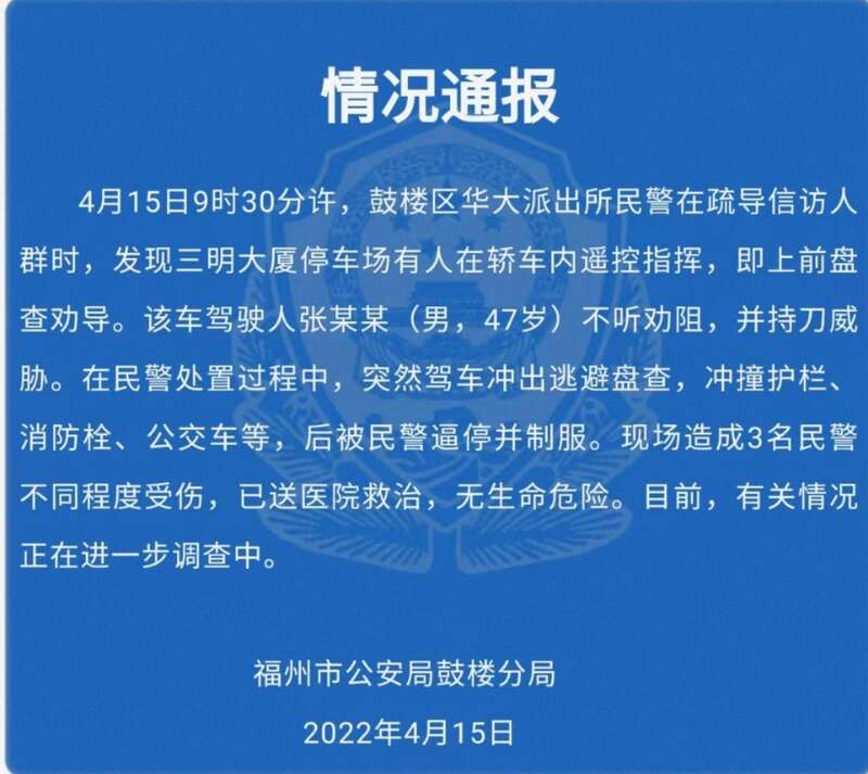 据福州市公安局鼓楼分局通报,4月15日9时30分许,警察在疏导信访人群时,发现位于福州市华林路的三明大厦停车场有人在轿车内遥控指挥,即上前盘查劝导。该车驾驶人张某某(男,47岁)不听劝阻,并持刀威胁。在警察处置过程中,张某某突然驾车冲出逃避盘查,冲撞护栏、消防栓、公交车等,后被逼停并制服。现场造成3名警察不同程度受伤,已送医院救治,无生命危险。