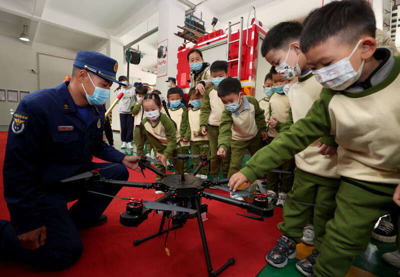 4月14日,在安徽全椒县消防救援大队,消防员向小朋友们展示消防救援无人机。