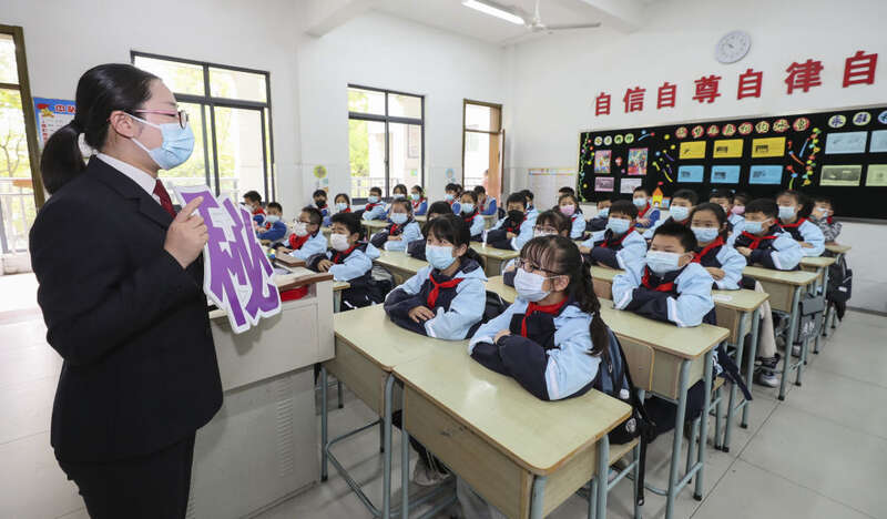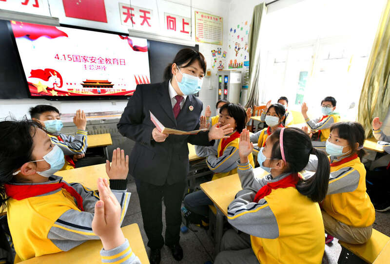 4月14日,在河南省焦作市温县第三实验小学,法官为学生进行国家安全教育。