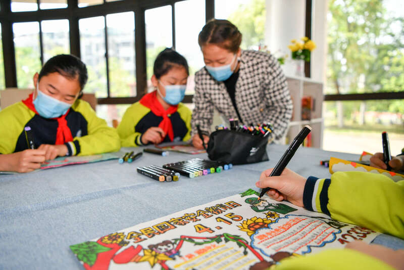 4月14日,浙江省湖州市长兴县水口乡中心幼儿园的孩子们创作国家安全教育主题绘画。