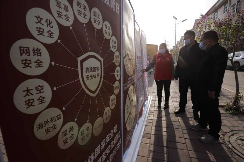 4月14日,居民在河北省遵化市西三里镇一社区观看国家安全相关知识展览。